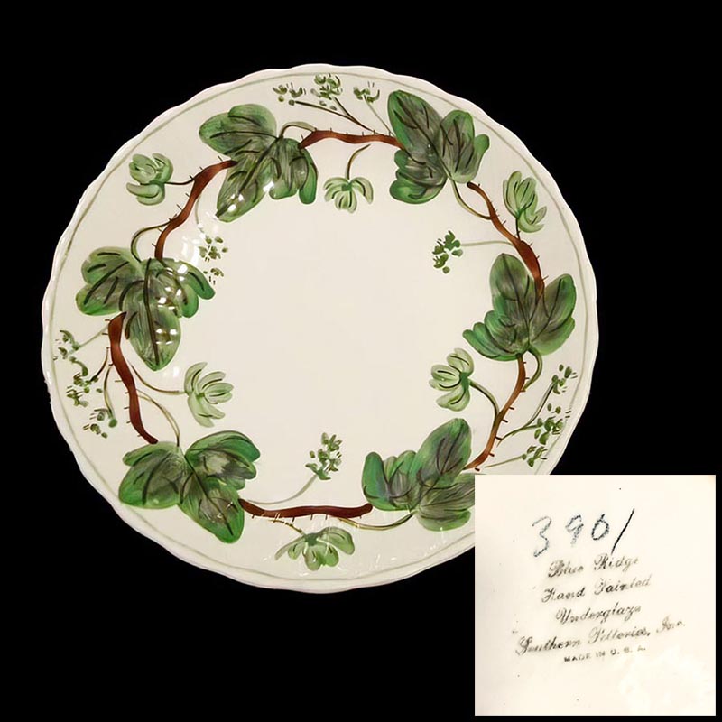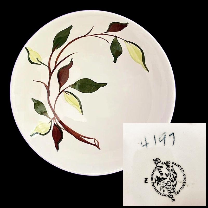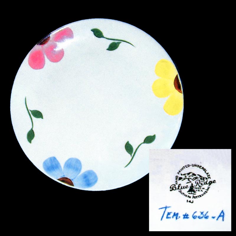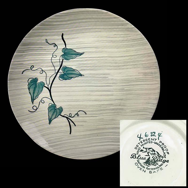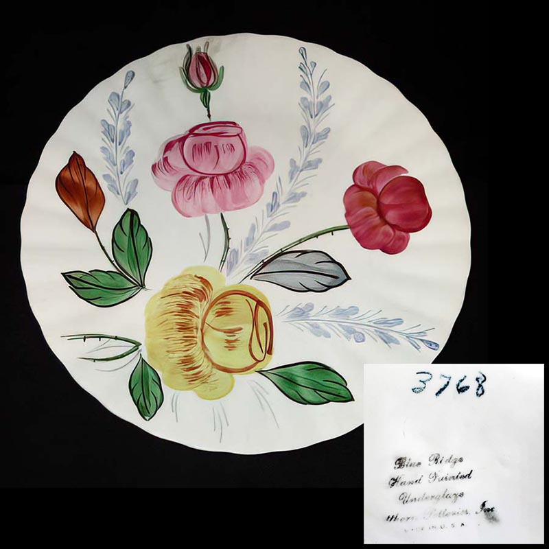 In general, these pattern names are based on the names given in John and Frances Ruffin's three books, Blue Ridge China Today, Blue Ridge China Traditions, and Blue Ridge China Treasures.My intention is to add as many pictures as possible to aid those who don't have access to any of the various Blue Ridge books, but I'll need some help to do it. If you have any pieces of a pattern for which a picture isn't shown, you can help others by sending a picture (a dinner plate works best). Also, if you have a pattern (and number) that is not shown on this page, that information would be greatly appreciated as well.