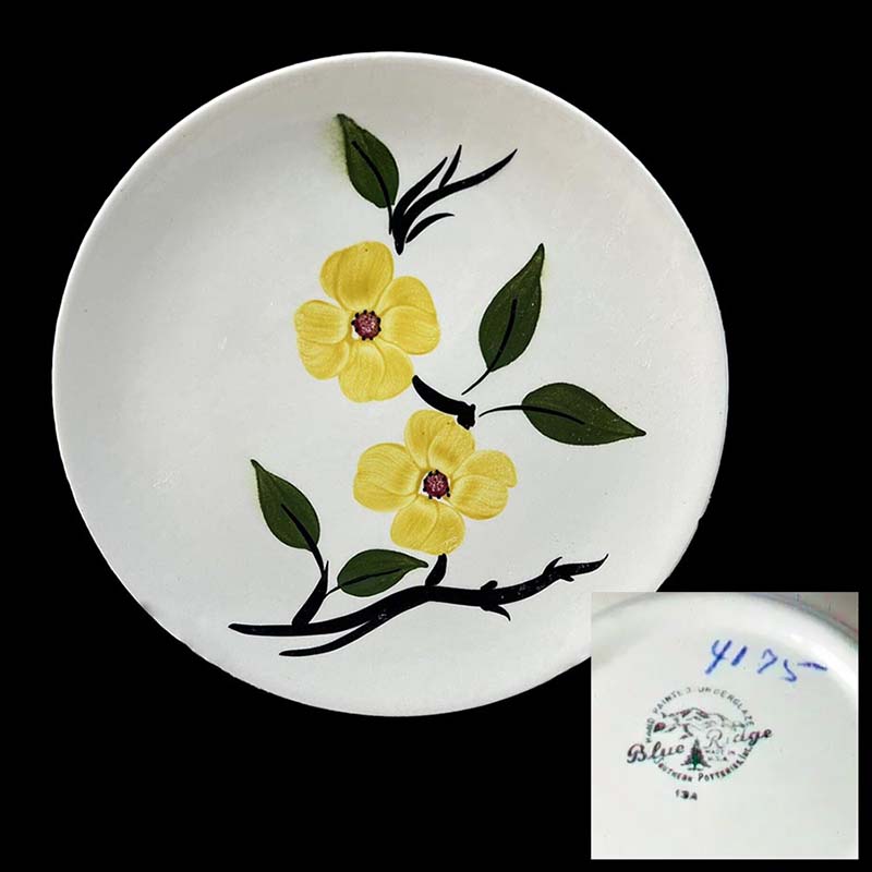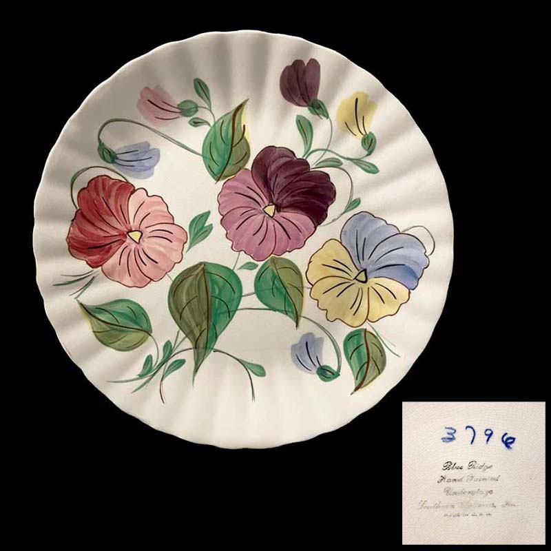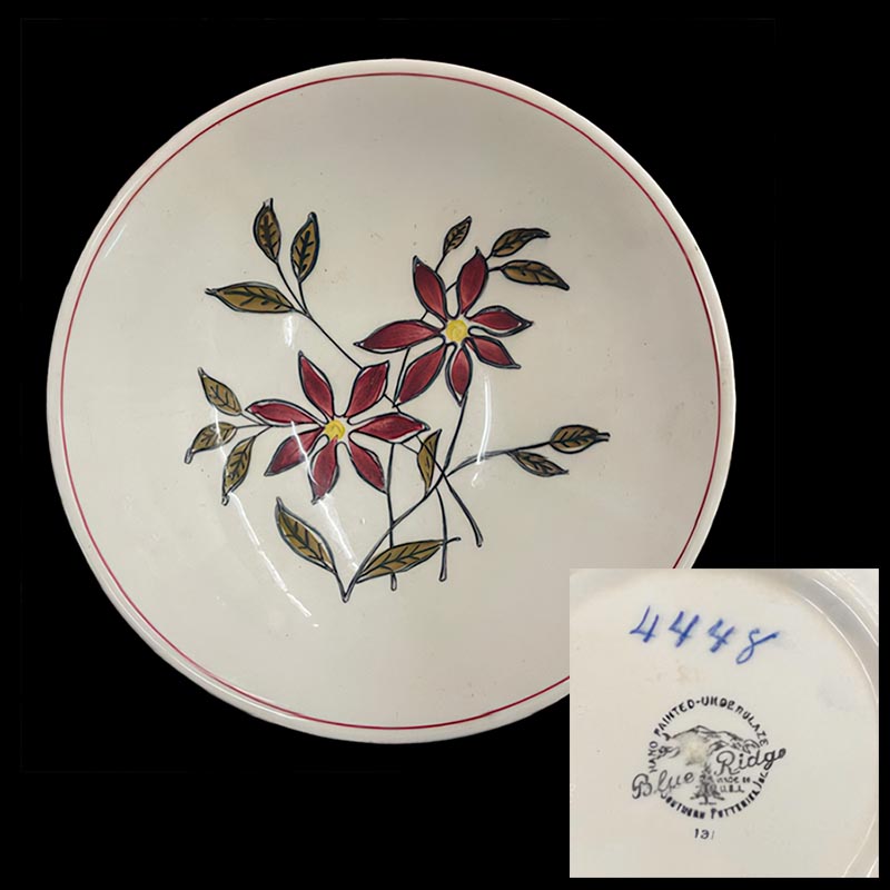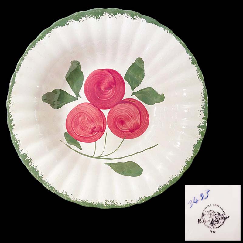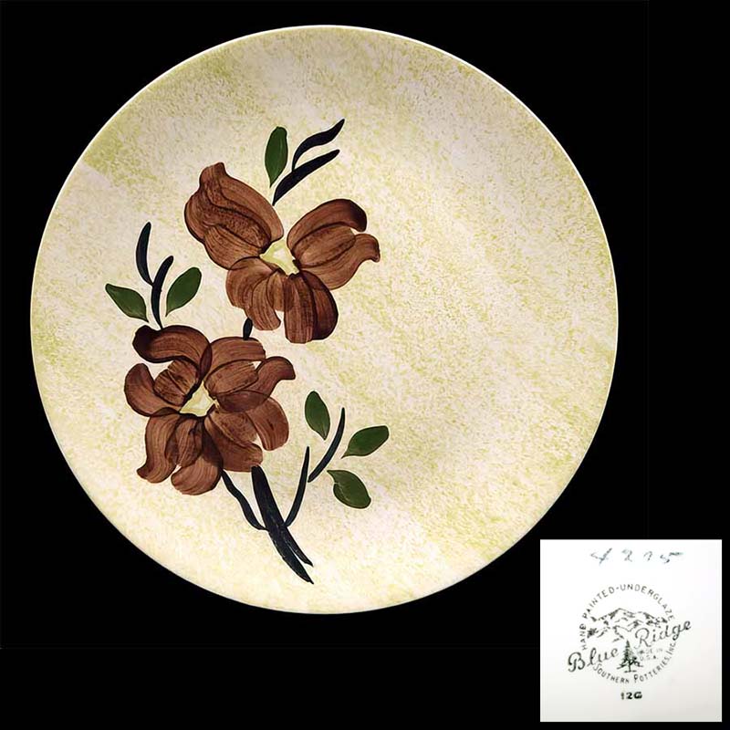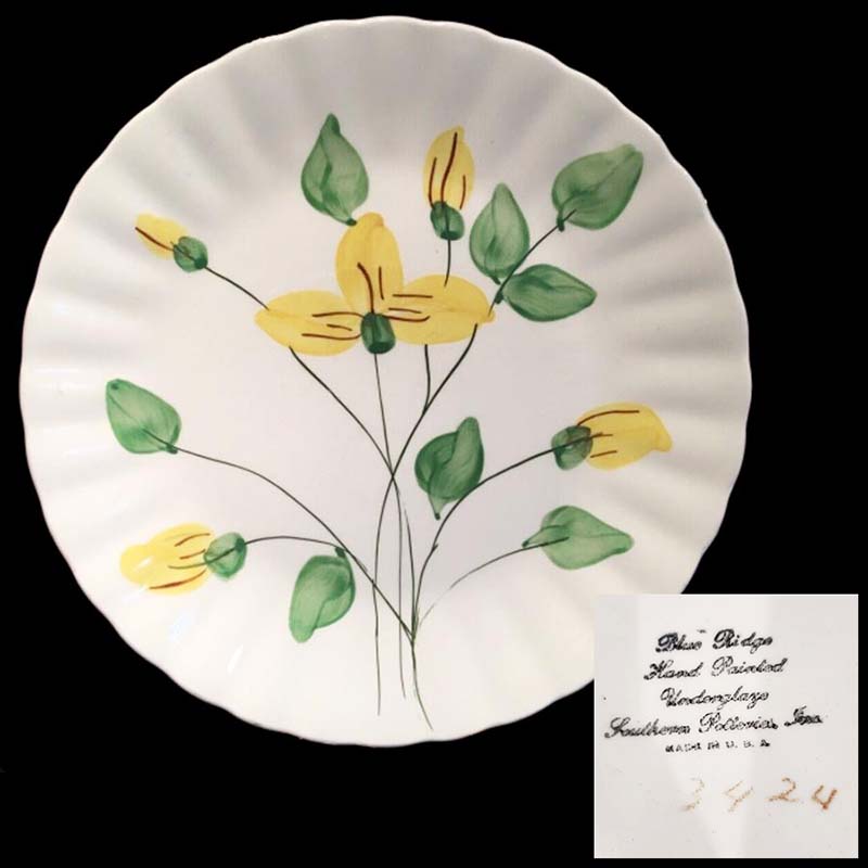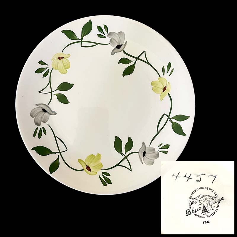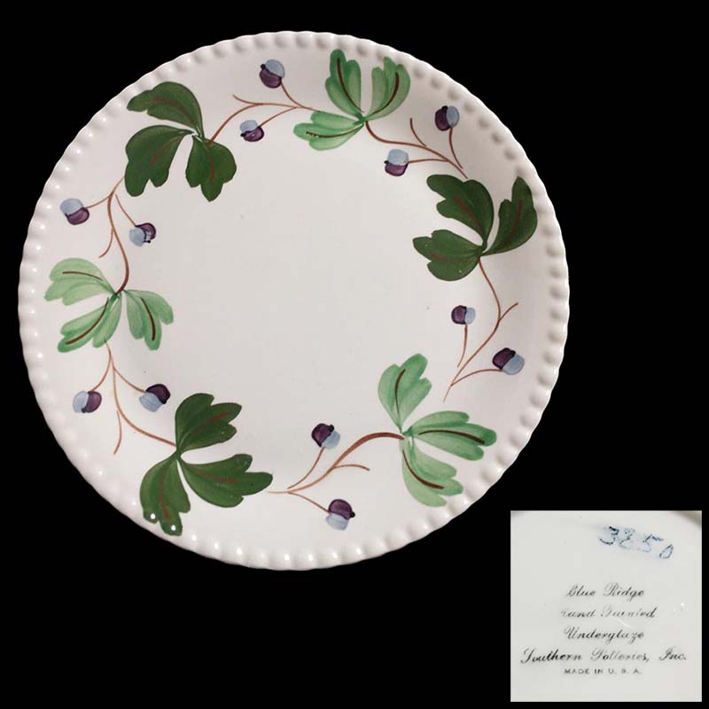In general, these pattern names are based on the names given in John and Frances Ruffin's three books, Blue Ridge China Today, Blue Ridge China Traditions, and Blue Ridge China Treasures.My intention is to add as many pictures as possible to aid those who don't have access to any of the various Blue Ridge books, but I'll need some help to do it. If you have any pieces of a pattern for which a picture isn't shown, you can help others by sending a picture (a dinner plate works best). Also, if you have a pattern (and number) that is not shown on this page, that information would be greatly appreciated as well.
