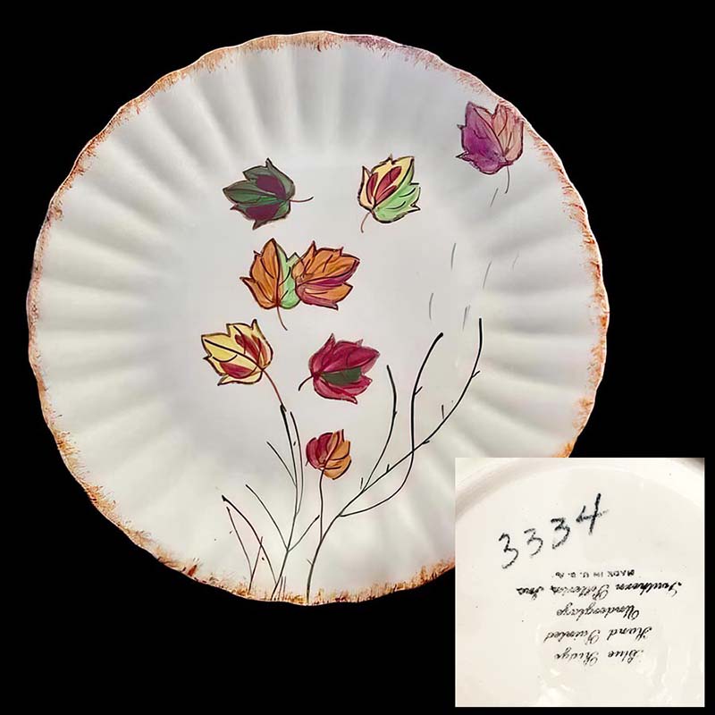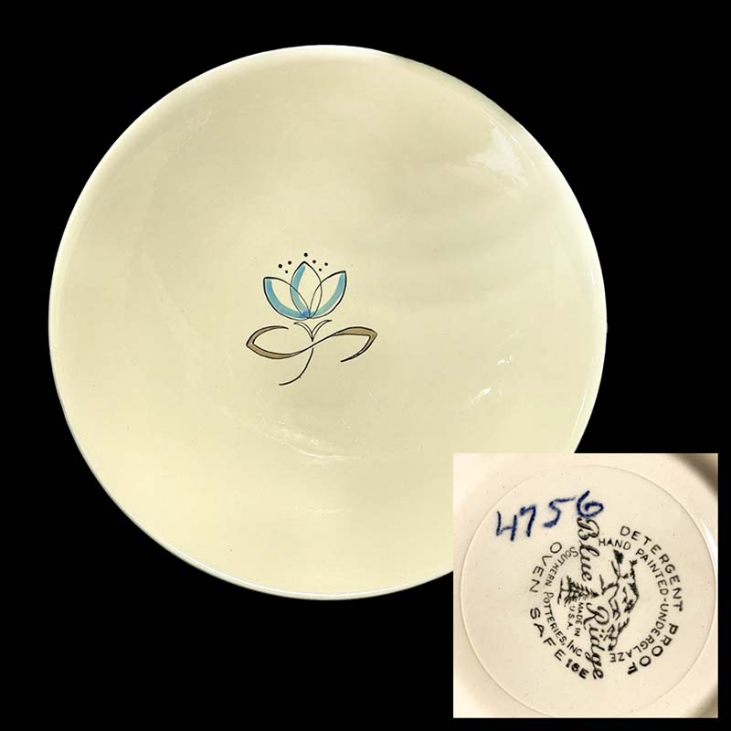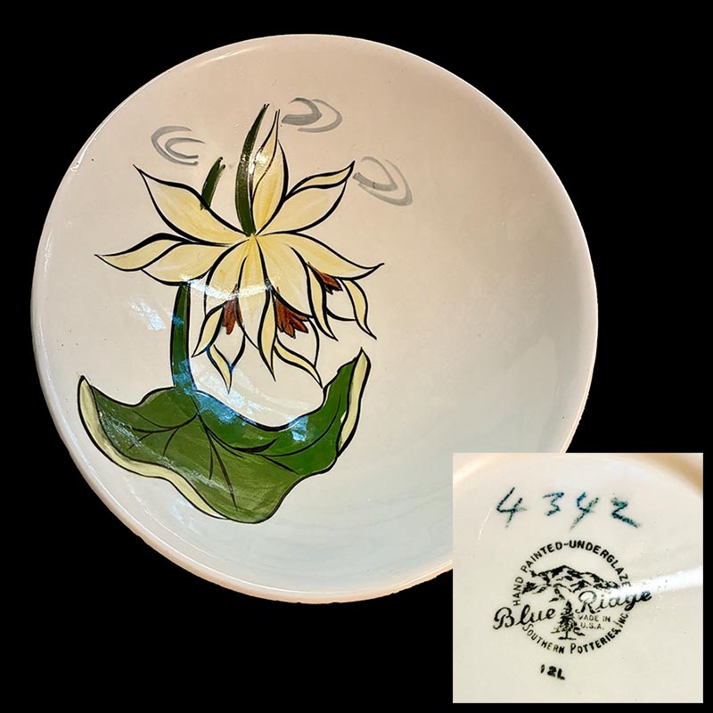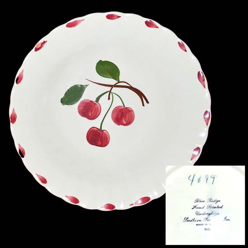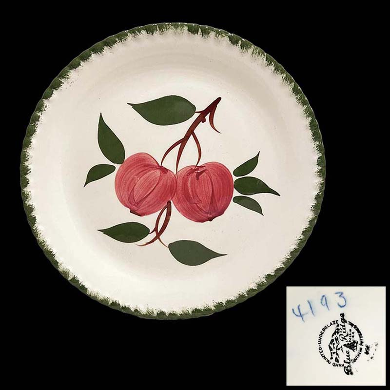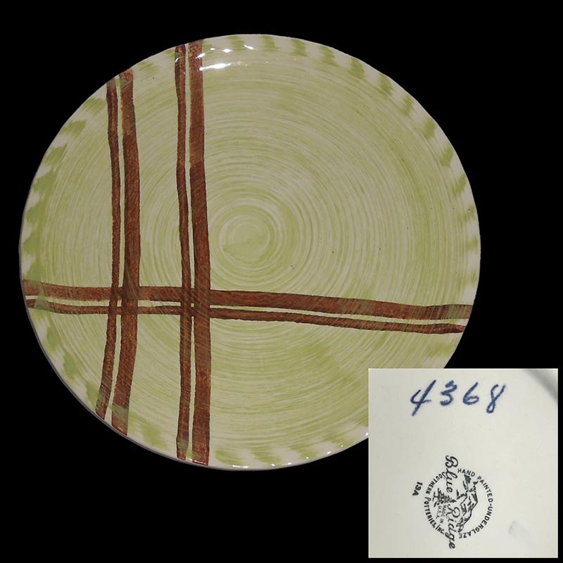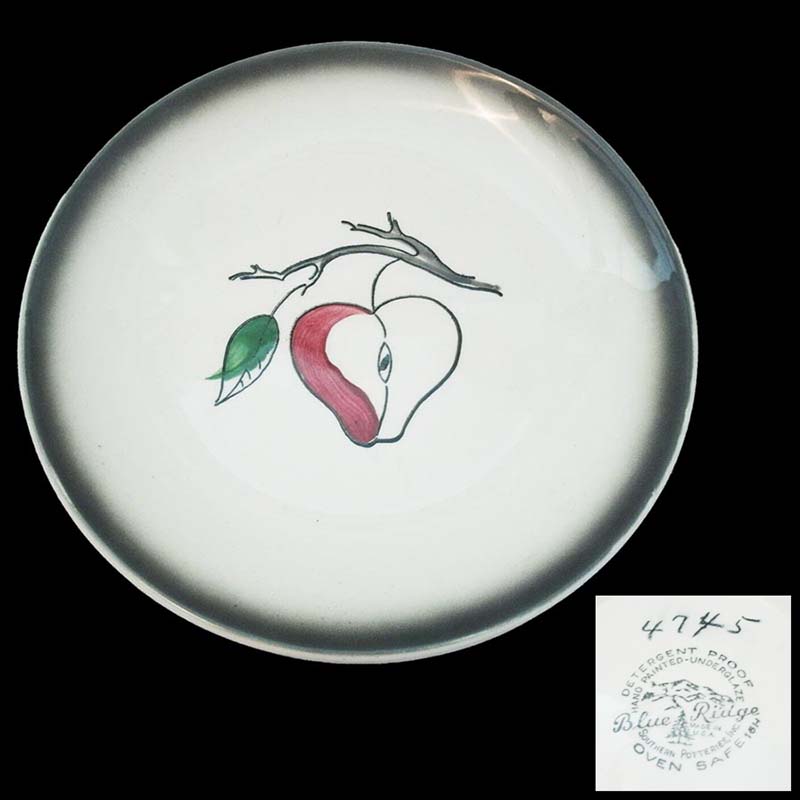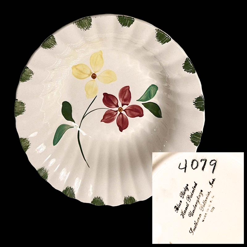 In general, these pattern names are based on the names given in John and Frances Ruffin's three books, Blue Ridge China Today, Blue Ridge China Traditions, and Blue Ridge China Treasures.My intention is to add as many pictures as possible to aid those who don't have access to any of the various Blue Ridge books, but I'll need some help to do it. If you have any pieces of a pattern for which a picture isn't shown, you can help others by sending a picture (a dinner plate works best). Also, if you have a pattern (and number) that is not shown on this page, that information would be greatly appreciated as well.